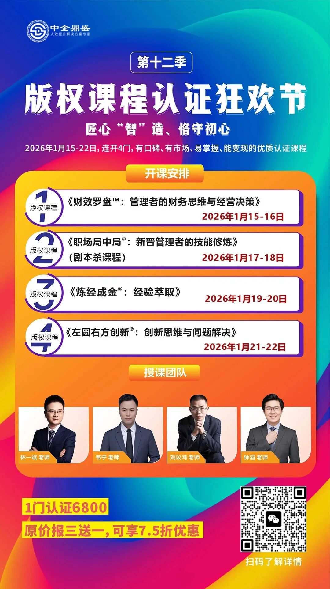 新年计划别只写“多读书、多锻炼”,真正的成长是悄悄把技能树点亮。中企鼎盛把2026年1月15日到24日排成一条“能力加速带”:2天财务决策+5天剧本杀管理+2天经验萃取+2天创新破局认证。每天只聚焦一件事:让你带着完整工具包和独家版权认证回家,2026刚开局就比别人多7张王牌。