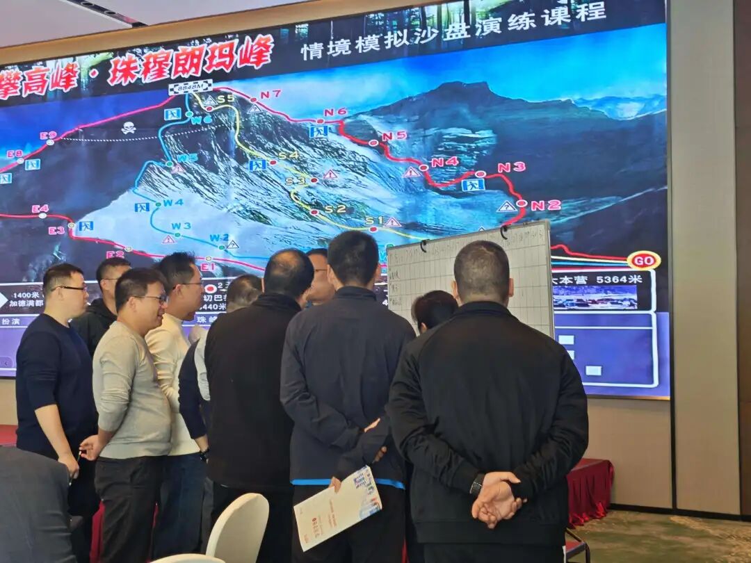 意犹未尽的户外热身之后,活动转入室内,迎来了本次团建的核心环节------《勇攀高峰》情境沙盘推演。